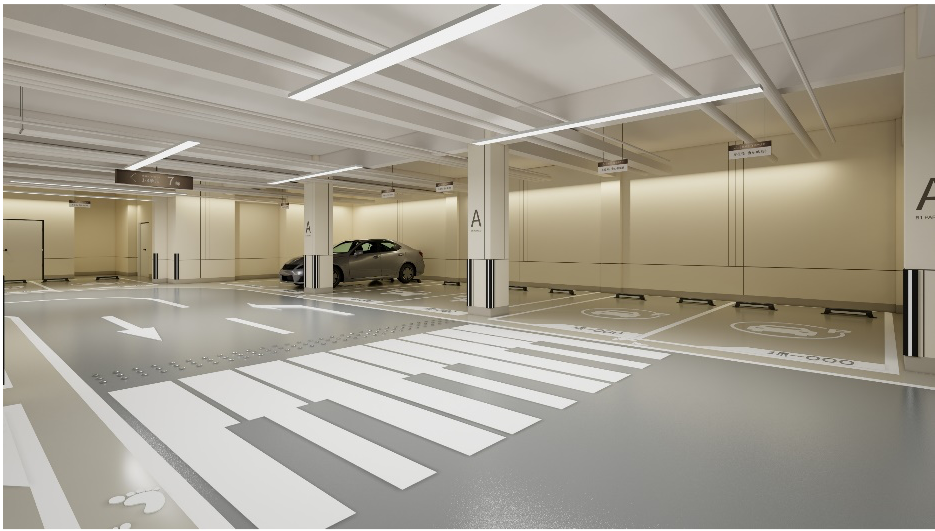 在品質(zhì)化車庫(kù)的趨勢(shì)下,圍繞色彩、裝飾、材料進(jìn)行了全方位設(shè)計(jì)。墻面以暖米色為主,搭配咖色線條,頂、地面均采用暖灰色,搭配暖白色系燈光,全面打造溫馨舒適的歸家體驗(yàn)。地面裝飾采用了個(gè)性化的車位標(biāo)識(shí)、鋼琴造型斑馬線、入戶迎賓毯涂刷,打造獨(dú)特藝術(shù)品味感。墻面材料精選耐高溫、防潮、防霉的立邦無(wú)機(jī)內(nèi)墻體系,有效適應(yīng)車庫(kù)空間的環(huán)境條件,地面材料采用耐磨、防滑、抗裂的立邦無(wú)溶劑彈性聚氨酯體系,同時(shí)滿足高品質(zhì)車庫(kù)的裝飾與性能需求。