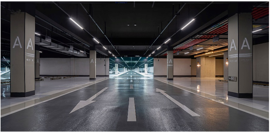 從建筑造型中提取簡約素雅的裝飾線條,在車庫墻柱面上規(guī)律延展排布,配合天花深灰色有序的管線布置,使得整體車庫空間愈加舒朗整潔。地面裝飾采用了動感的波浪造型斑馬線、入戶迎賓毯涂刷,搭配車庫內(nèi)部清晰的標識引導,營造高效的歸家路線指引。材料方面推薦采用立邦無機內(nèi)墻體系,提供良好的防潮和防霉性能,有助于保持車庫墻面的美觀;地面選用立邦無溶劑彈性聚氨酯體系,耐磨、防滑,多維滿足品質(zhì)車庫的裝飾與功能需求。