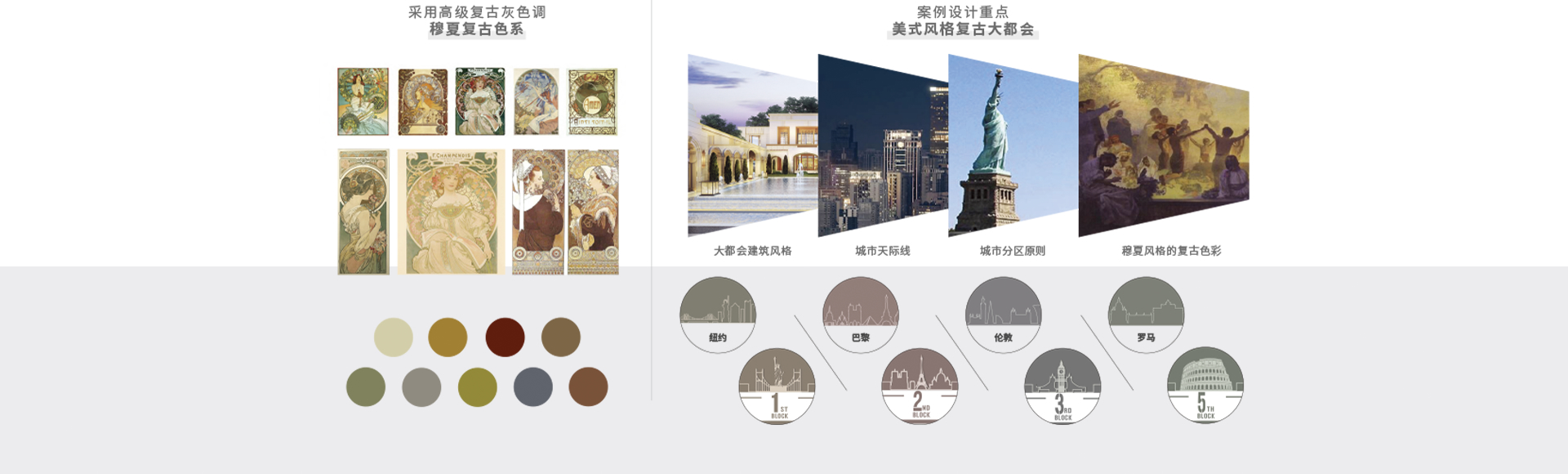 為了延續(xù)建筑復(fù)古大都會設(shè)計風(fēng)格,精選四座國際大都會城市作為車庫的街區(qū)式概念,墻、地面均選用復(fù)古的暖色系,并追求同色系搭配的細(xì)膩感。墻面圖形以代表性城市建筑為主題,輔以城市天際線,烘托出高級住宅品質(zhì)的氛圍感。
