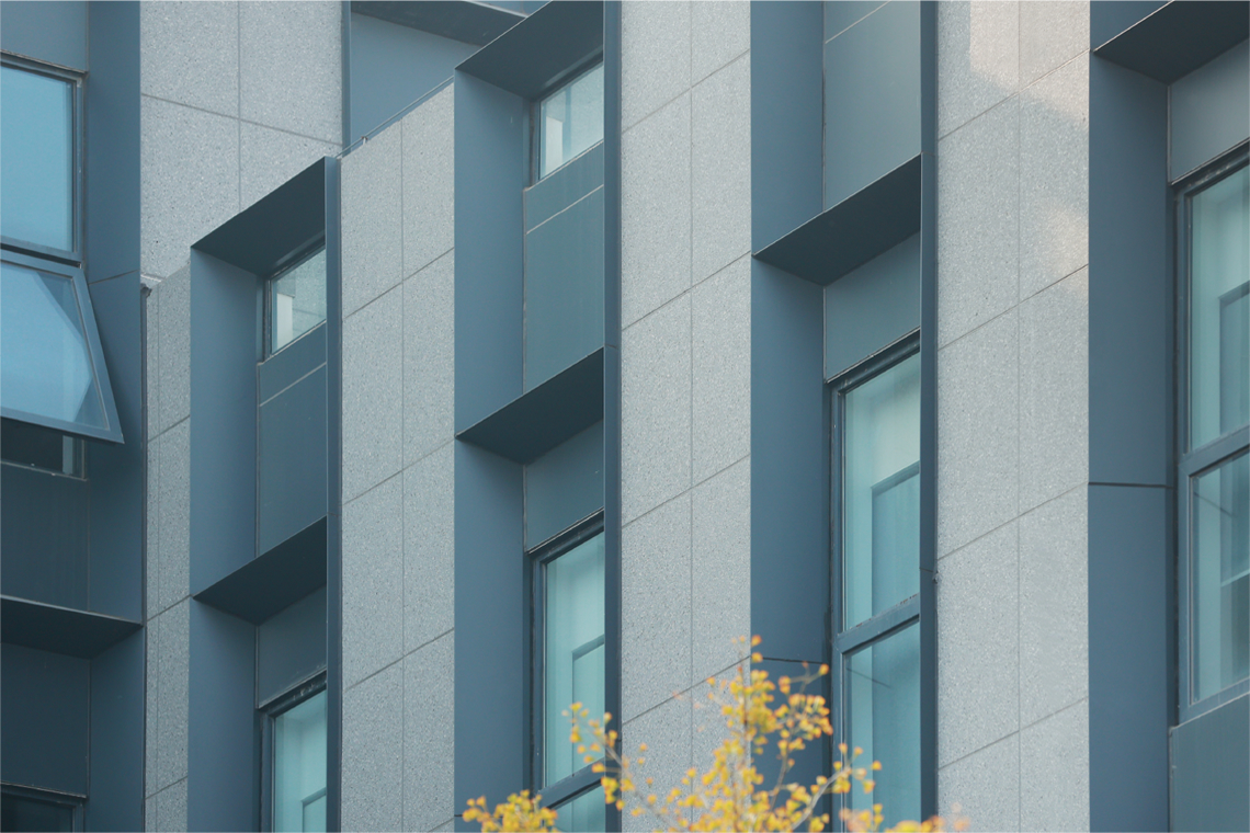 整體外觀造型采用簡潔的直線條,通過大小、長寬比的不同,做出形態(tài)不一、富有韻律和節(jié)奏的線條變化。整齊劃一的高飽和度橙色充滿了陽光、活力,與灰色質(zhì)感帶來的沉穩(wěn)形成視覺的平衡,搭配保溫裝飾一體板、金屬質(zhì)感涂料等多元現(xiàn)代化材料,打造了一個高新現(xiàn)代、充滿活力的園區(qū)環(huán)境。