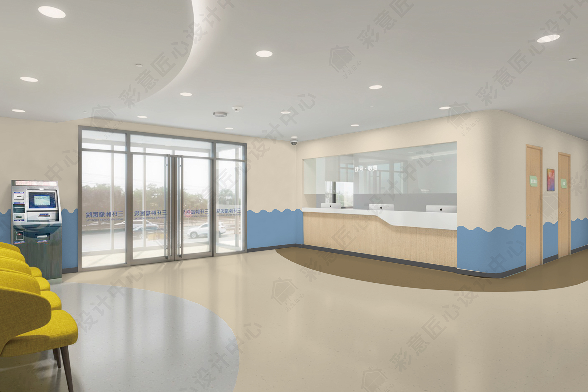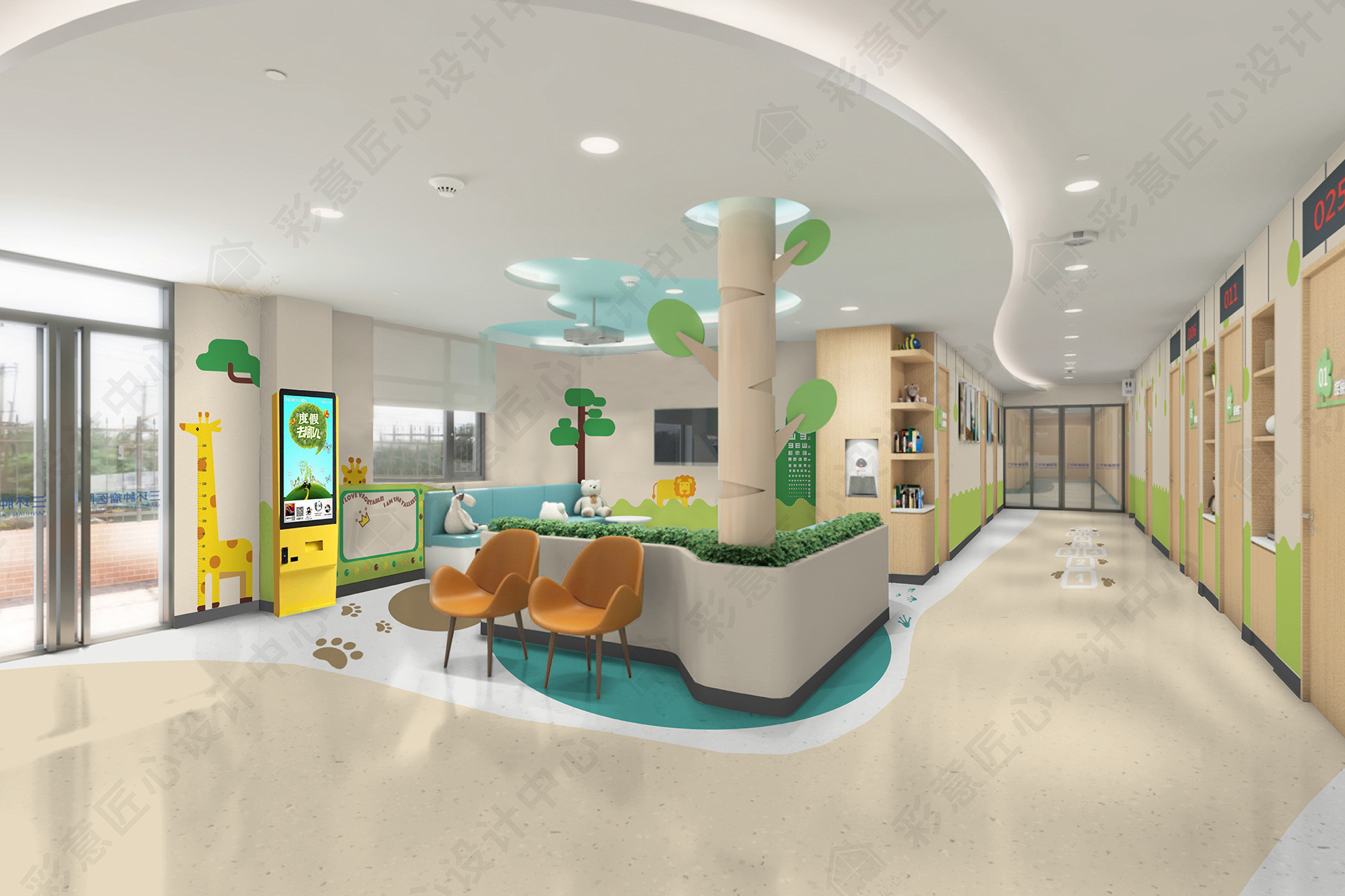 本項(xiàng)目覆蓋兒童診療區(qū)、大廳等候區(qū)、走廊等公共活動(dòng)區(qū)域,結(jié)合兒童預(yù)防中心功能特征和空間使用人群特點(diǎn)進(jìn)行內(nèi)墻、地面一體化色·材設(shè)計(jì)。