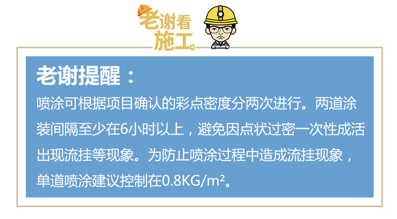 在噴涂質(zhì)感多彩層工序時(shí),噴槍仍需保持與墻面40-60cm的距離,以每秒0.8-1.0m的噴槍走速均勻噴涂。噴涂靠下區(qū)域時(shí)可適當(dāng)加快走槍速度,料罐中物料減少時(shí)噴涂氣壓要適當(dāng)調(diào)小,否則可能會(huì)造成色點(diǎn)集中噴出,不易控制噴涂效果。