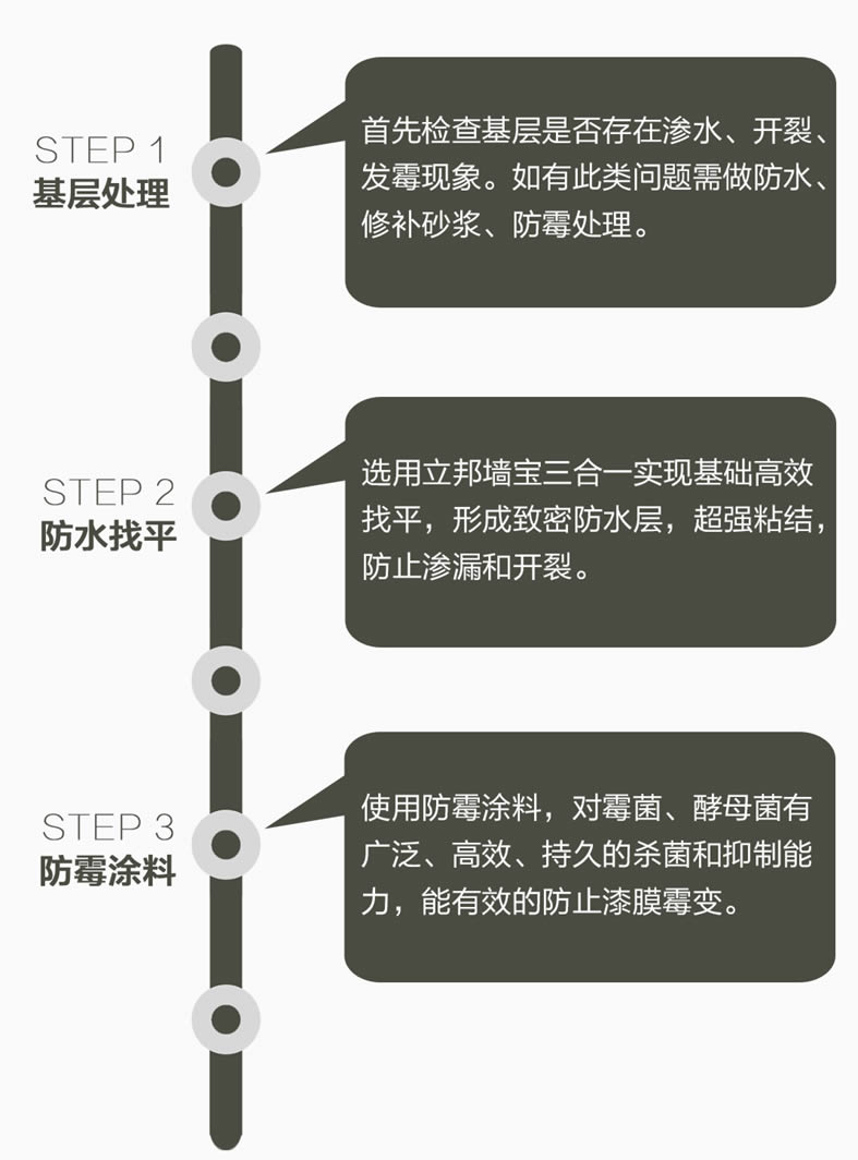 解決墻面霉菌要從源頭解決問(wèn)題,在做好防水防潮和通風(fēng)工作之后,還要阻隔基層內(nèi)水汽滲出,消除易于霉菌成長(zhǎng)的環(huán)境。