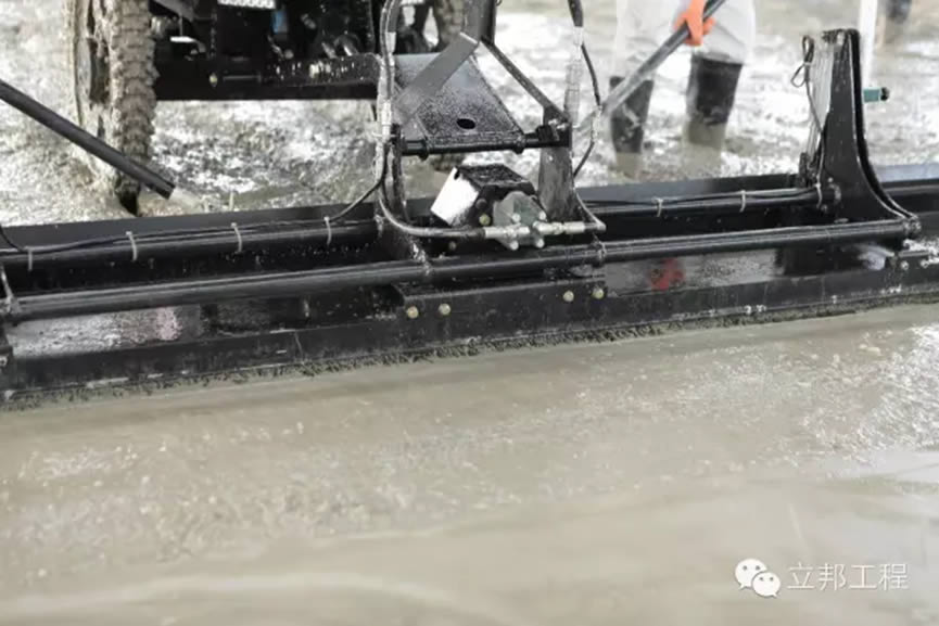 混凝土施工厚度為20cm,先使用激光發(fā)射器通過發(fā)射激光信號,確定混凝土攤鋪施工的高度,并通過激光接收器測量混凝土高度是否合格。然后使用激光整平機施工,確?;炷疗矫姹3衷谠O(shè)計高度,在施工過程中必須一人負責移動激光整平機,兩人負責前端輔助攤平。