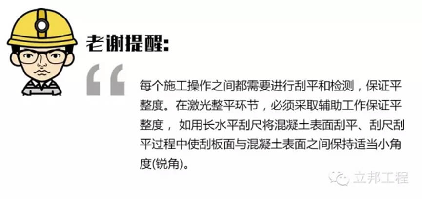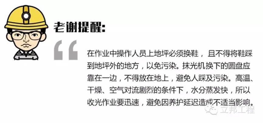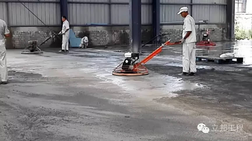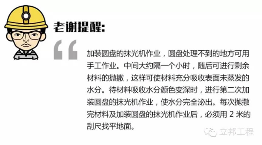 抹光機作業(yè)應(yīng)縱橫向交錯進行,在抹光機作業(yè)不到的地方用手工鐵鏝作業(yè)。