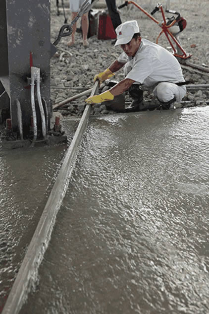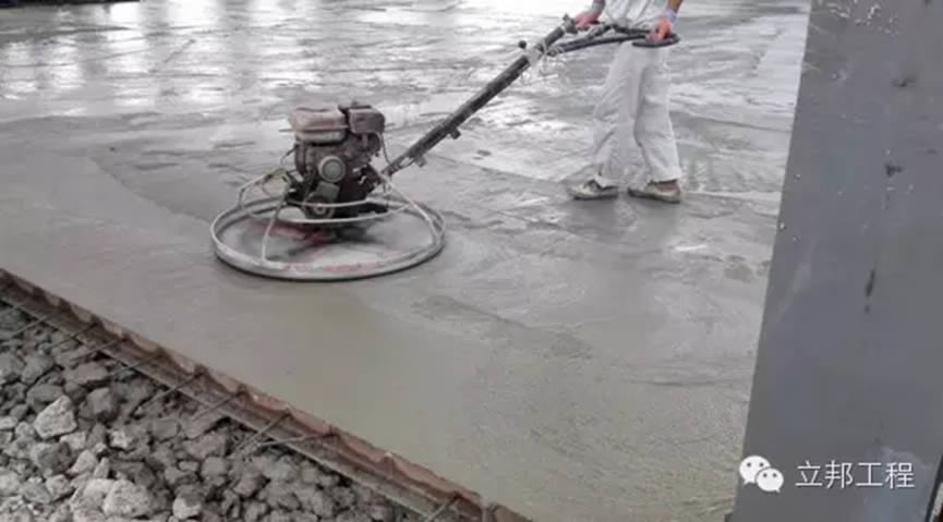 使用單盤及雙盤抹光機,安裝搓平圓盤,在混凝土泌水初凝時反復(fù)搓平,直到提出混凝土漿料。