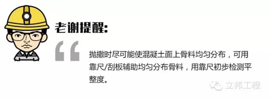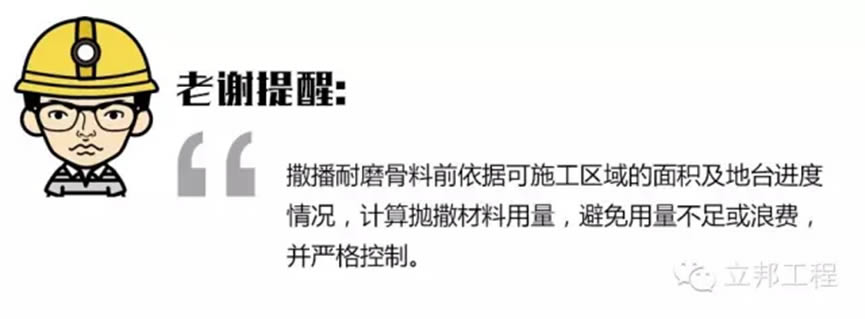 特殊材料可視具體條件,分二次以上拋撒。第一次拋撒用量的2/3;第二次拋撒剩余的1/3;兩次撒骨料的時間間隔不宜太長。