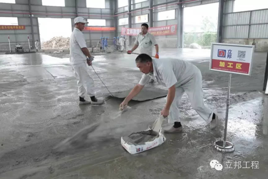 耐磨地坪機械化施工第四步:拋撒耐磨骨料