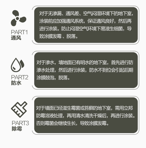 特別要說明的是,由于建筑防火要求越來越高,地下空間大多需要達(dá)到A級(jí)防火等級(jí)。這次為大家介紹的新裝備就是集裝飾、防霉、防火為一體的立邦無機(jī)防霉墻寶,針對(duì)防霉要求高的基面,它不僅安全防火,實(shí)現(xiàn)拒霉菌于墻面之外的功能,還有不錯(cuò)的裝飾性效果。不僅適用于住宅、公共場所、非住宅的地下室,也很適合舊墻翻新工程。