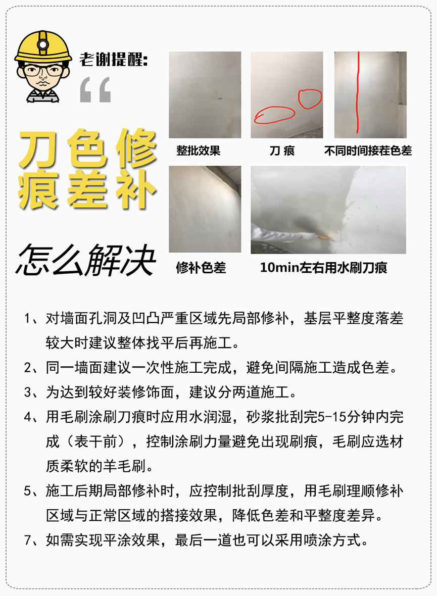 一個(gè)面或隔墻一次性施工,避免接茬與色差,
