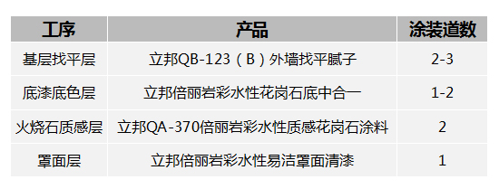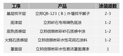 立邦技術(shù)研發(fā)部門經(jīng)過精心的原材料篩選及配方設(shè)計,堅持不懈地研發(fā)探索和試驗驗證,最終獲得了以高乳液含量配方模型為基礎(chǔ)的高耐候、超抗污的水包砂成熟配方,以一種材料實現(xiàn)了傳統(tǒng)工藝兩種材料的火燒面花崗巖效果,減掉了相對復(fù)雜且最難把控的砂壁質(zhì)感中涂層的底色噴涂工序,從材料根源上徹底解決了麻砂面花崗巖體系的發(fā)花風(fēng)險,同時不僅大大縮短了施工周期,還減化了現(xiàn)場物料管理工作。