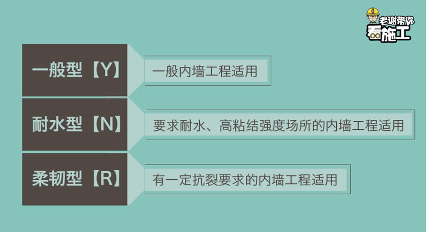 按照建工標準,膩子可以分為外墻膩子和內墻膩子兩種。用于內墻的膩子又分為一般型(Y)、耐水型(N)和柔韌型(R)三種。我們可以從分類名稱上就可以很直觀地看到,適用于要求耐水、高粘結強度場所室內裝飾工程的N型內墻膩子,正是阻擊“回南天”對內墻影響的最好選擇。Y型內墻膩子耐水性差,會軟化吸水,致使墻面長霉斑。R型內墻膩子則容易長鼓泡。