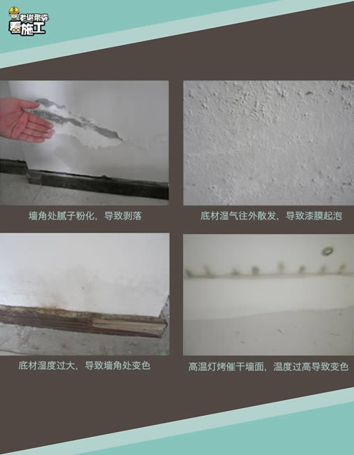 墻腳至離地50cm高的部位,建議先不批刮膩子,避免瓷磚、踢腳線以及地面積水時的高潮汽由地面順著砂漿層往墻面走,砂漿水份被接觸的膩子層吸收,導致膩子層膨脹粉化剝落,濕氣外沖使漆膜鼓泡和變色。