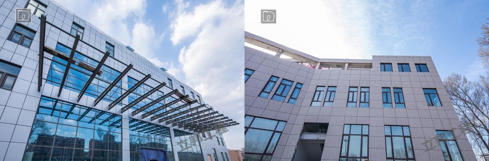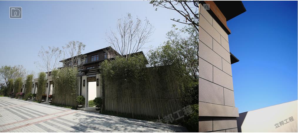 外墻采用質(zhì)感外墻非金屬板顆粒平噴效果和火燒面麻砂石效果