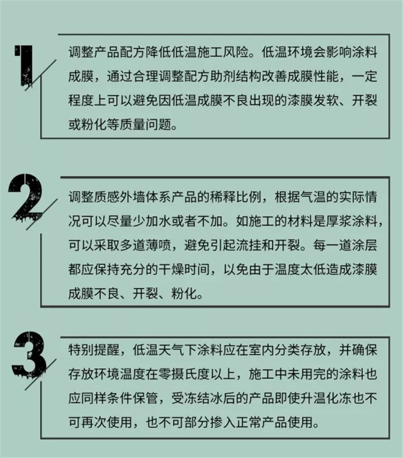 l  調(diào)整產(chǎn)品配方降低低溫施工風(fēng)險:低溫環(huán)境會影響涂料成膜,通過合理調(diào)整配方助劑結(jié)構(gòu)改善成膜性能,一定程度上可以避免因低溫成膜不良出現(xiàn)的漆膜發(fā)軟、開裂或粉化等質(zhì)量問題。