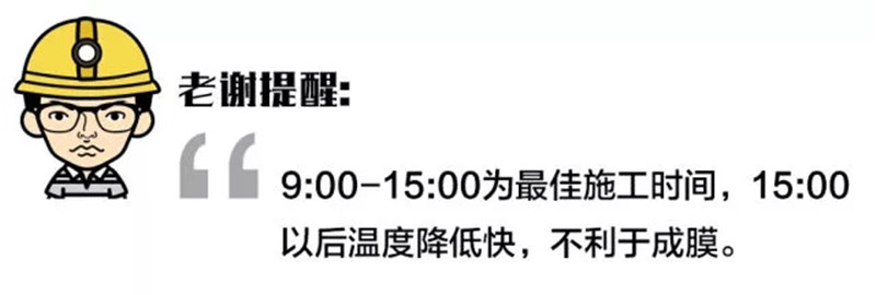 9:00—15:00為最佳施工時間,15:00以后溫度降低快,不利于成膜。