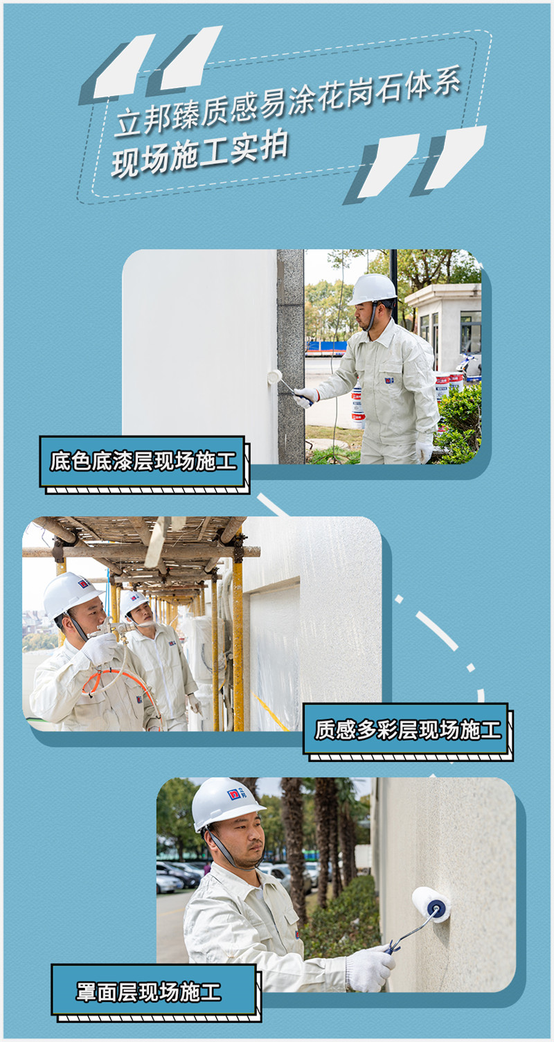 現(xiàn)場施工完成基層找平后,僅需涂刷1-2道專用配套底中合一、噴涂質感多彩層(臻質感易涂花崗石),最后為保障整體效果,輥涂一層水性易潔罩面清漆即可。