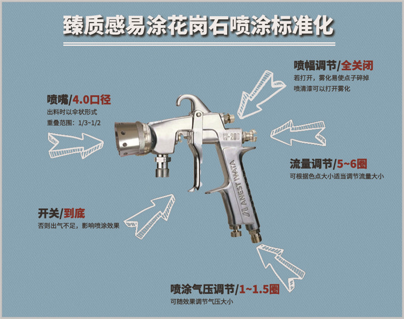 在進行質感多彩層的施工時,特別提醒需要保證空壓機壓力不低8kg/cm2(380V三相空壓機),噴槍型號4.0或5.0(對應噴嘴內(nèi)徑4mm或5mm),供壓穩(wěn)定出料均勻,以確保實現(xiàn)高端大氣上檔次的石材紋理飾面效果。
