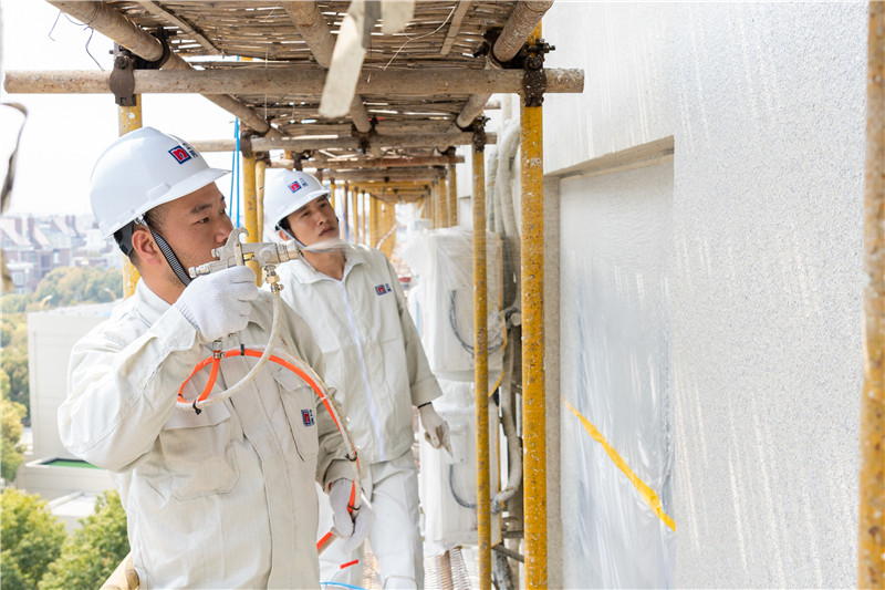 臻質感易涂花崗石雖然給施工工序做了減法,對現(xiàn)場施工工藝和手法的要求依然嚴格。施工師傅心靜手穩(wěn),噴涂從容均勻,搭接和停頓的位置放在拐角和分格縫處,交接口的噴涂始終保持著一致的走槍速度,以保證噴涂后的漆膜密度保持相同。