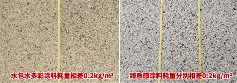 以耗量相差0.2kg/m2為例,同一批水包水涂料上漆量不同會出現(xiàn)明顯的顏色深淺不一,但是臻質感涂料的界限感并沒有很明顯,只要達到建議上漆量要求后,即使局部出現(xiàn)了噴涂不均的現(xiàn)象也不會有明顯發(fā)花,同時也依然可以隨時修補,非常方便。