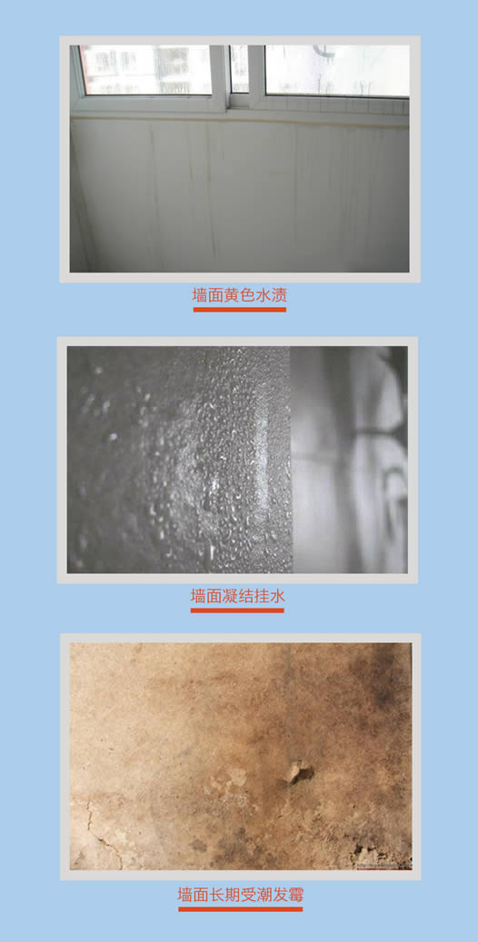 每次遭遇“回南天”,房間內(nèi)的墻壁和地面總會(huì)“淚流不止”,出現(xiàn)掛水現(xiàn)象。這些凝結(jié)在墻上的水珠將室外的霧霾和室內(nèi)的灰塵混合在一起,就會(huì)在墻壁上形成黃色的印子。如果水珠凝結(jié)過大,還會(huì)在墻上留下一道道臟兮兮的“淚痕”。如果回南天遲遲不走的話,墻面還會(huì)因?yàn)殚L期受潮引起發(fā)霉。面對這樣的“哭墻”,生活何來光照?