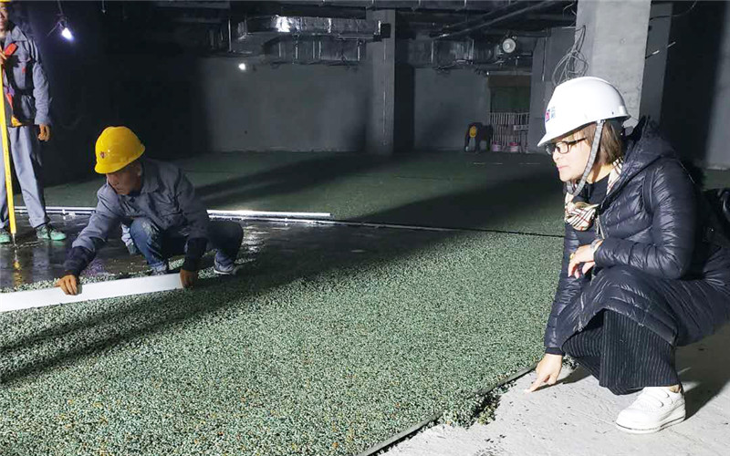 立邦工程應(yīng)用技術(shù)團(tuán)隊(duì)提出了環(huán)氧彩石地坪體系+“漏涂施工“的方案,并在館內(nèi)負(fù)一層選擇了一塊最低洼潮濕的區(qū)域進(jìn)行工藝測(cè)試。