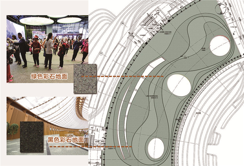 具備透水性的彩石地坪往往在戶外應(yīng)用,為實(shí)現(xiàn)館內(nèi)的水循環(huán),建造生態(tài)化的美好環(huán)境,中國館首次將環(huán)氧彩石地坪應(yīng)用于室內(nèi)地面鋪裝并取得成功。