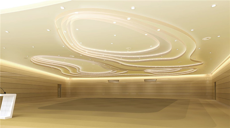 多功能區(qū)會(huì)議廳地面采用水泥彩色自流平材料+環(huán)氧面層,以自然漸變黃色系,與墻面呼應(yīng),配合燈光效果,恰如風(fēng)吹涌動(dòng)著金色的麥浪。