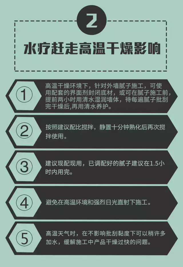 夏季暴曬,溫度過高,不僅底材易干,吸水快,過強(qiáng)的太陽光也會加速膩?zhàn)又兴值膿]發(fā)速度。導(dǎo)致施工后的膩?zhàn)颖砻娓稍锾?,出現(xiàn)批刮時(shí)卷皮、掉粉(水養(yǎng)護(hù)不夠)強(qiáng)度差以及批刮后開裂(厚批表面干里面濕)的現(xiàn)象。