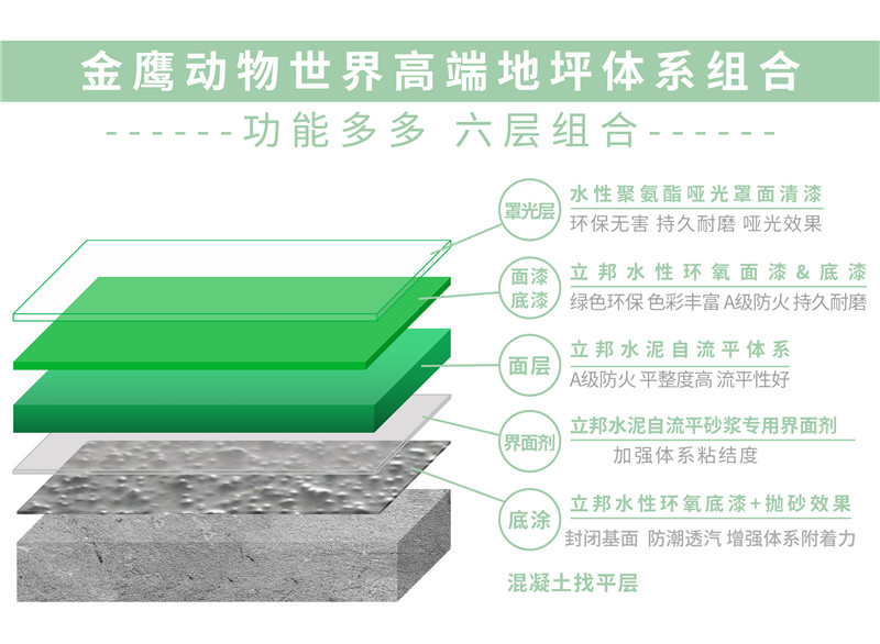 集環(huán)保、防火、耐磨、易施工、易清潔等多種功能于一體,搭配出色的色彩和效果運用,水泥自流平體系+水性環(huán)氧地坪體系+水性聚氨酯啞光罩面,這個“不簡單”的高端地坪體系組合不僅適配這種商業(yè)綜合體中的“動物王國”,同樣適用于博物館、藝術文化展館等場所,為更多建筑空間刷新綠色生命力。