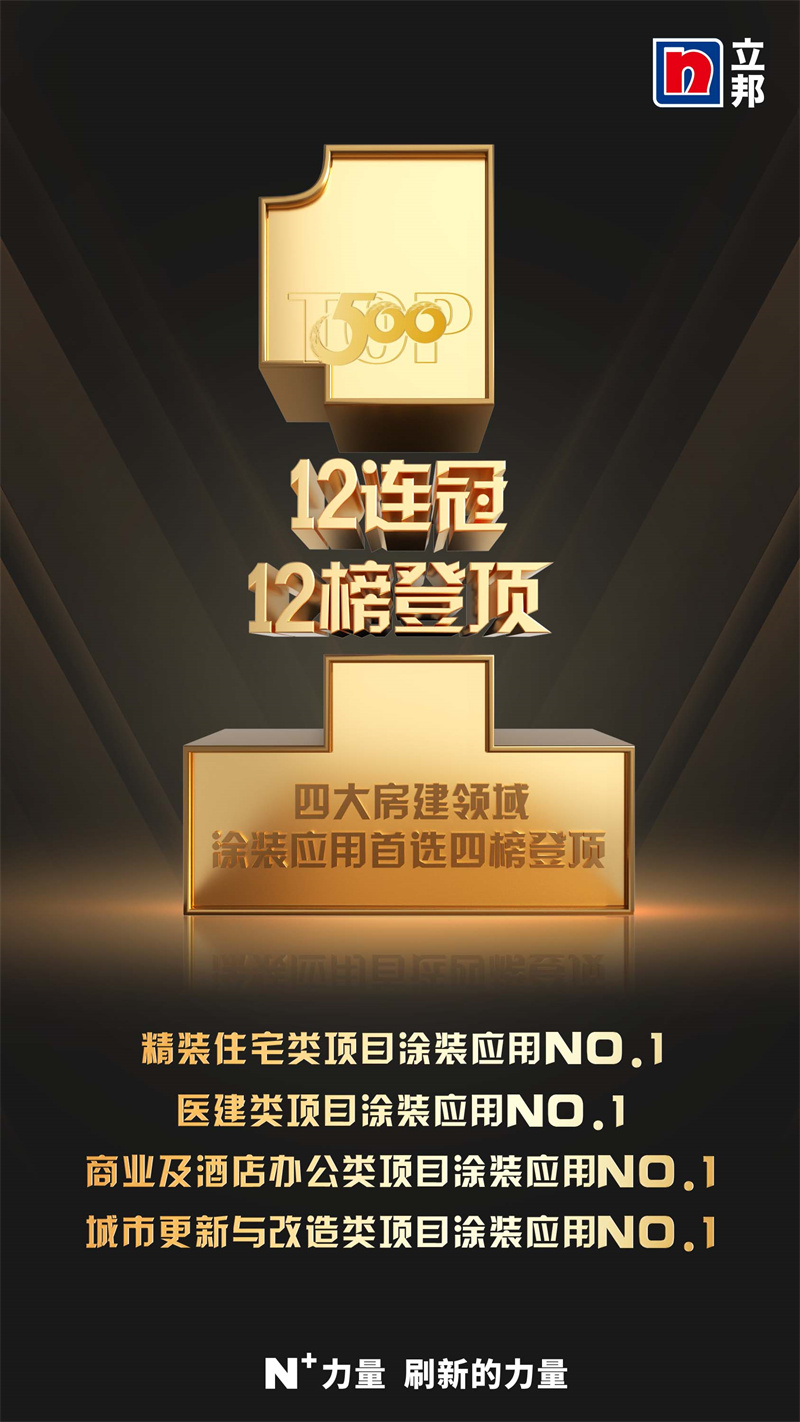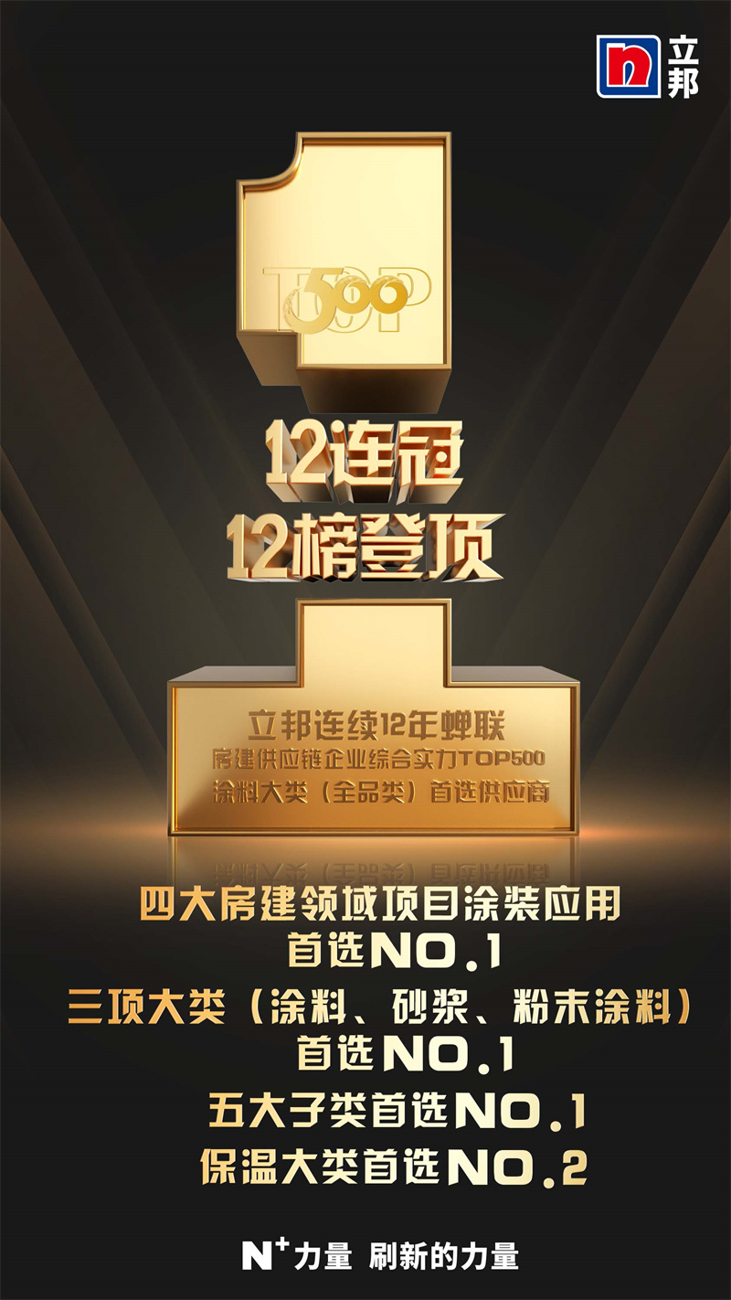 立邦獲評(píng)2023房建供應(yīng)鏈綜合實(shí)力TOP500-首選供應(yīng)商涂料大類(全品類)綜合實(shí)力榜首,不僅成為行業(yè)內(nèi)唯一連續(xù)12年蟬聯(lián)奪冠的涂料品牌,也在本次測(cè)評(píng)中穩(wěn)居12項(xiàng)排名榜首。其中,立邦在本次測(cè)評(píng)新增設(shè)的4大房建領(lǐng)域涂裝應(yīng)用首選排名中也取得了4榜登頂?shù)暮贸煽?jī)。