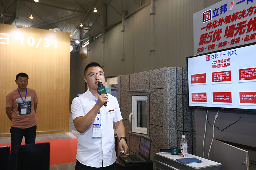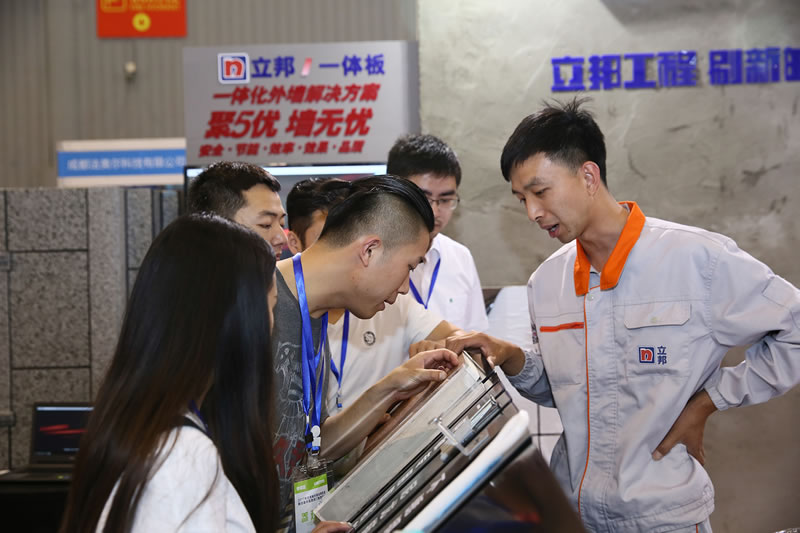 亮相本次住博會的立邦工程展區(qū)人氣爆棚,前來參觀了解的來賓絡(luò)繹不絕。為全面展示立邦一體板的無憂性能,現(xiàn)場不僅實物展示一體板結(jié)構(gòu)墻及拆分開的各部分構(gòu)造,同時通過視頻的方式,將一體板的相關(guān)性能、試驗過程以及外飾面效果一一呈現(xiàn)在來賓的面前。